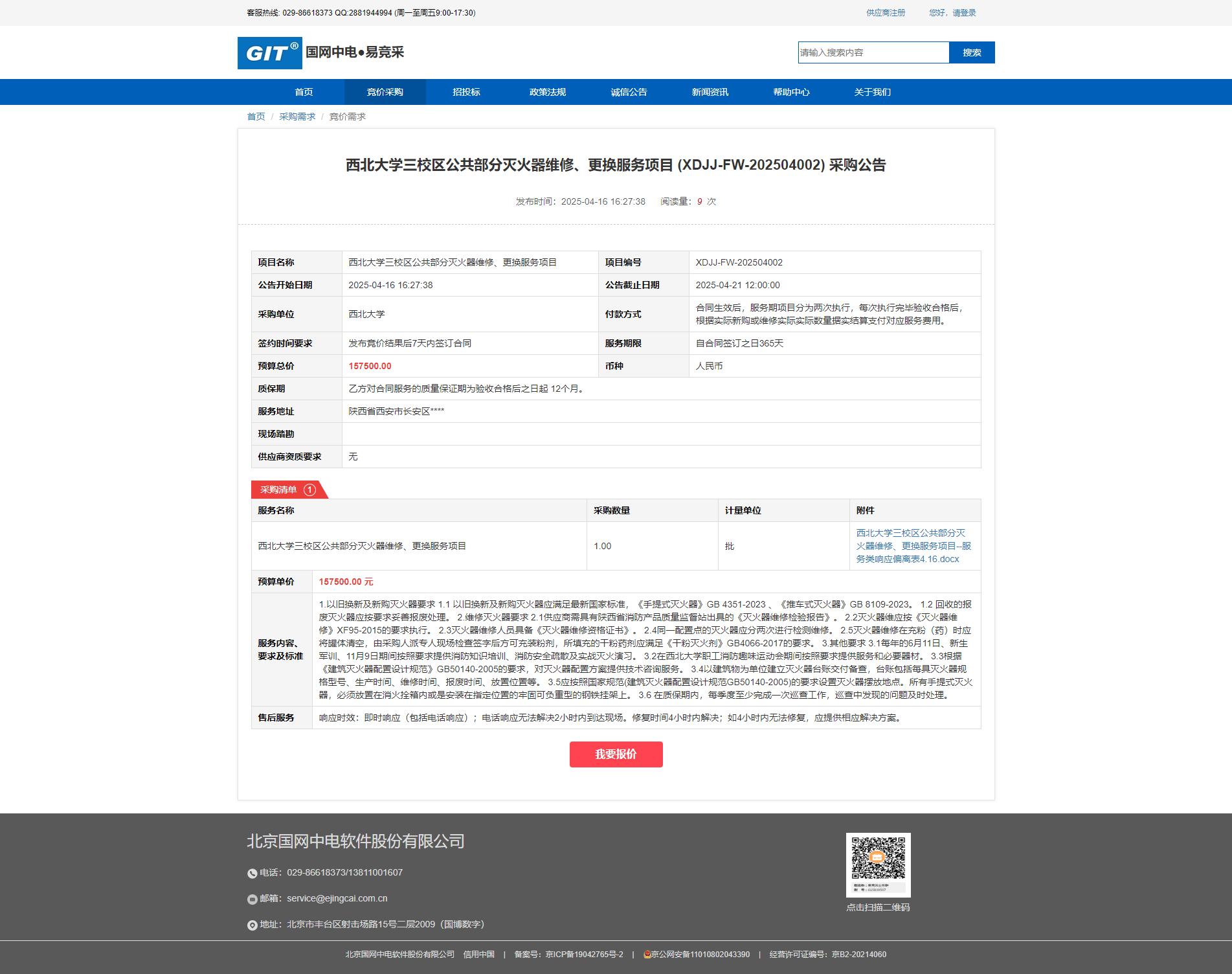 必赢3003no1线路检测中心三校区公共部分灭火器维修、更换服务项目 (XDJJ-FW-202504002) 采购公告