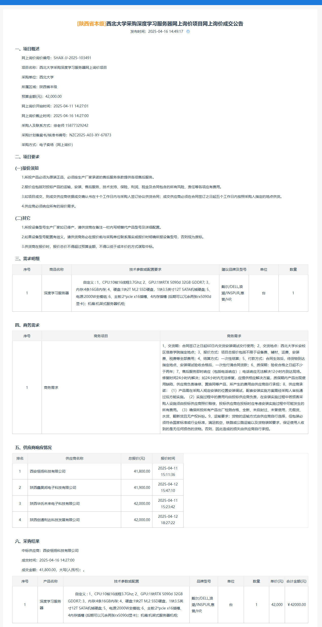必赢3003no1线路检测中心采购深度学习服务器网上询价项目网上询价成交公告 作者:采购与招标办公室 编辑: 时间:2025-04-23 原公告链接:https://www.ccgp-shaanxi.gov.cn/gpmall-main-web/basic/noticeDetail?noticeGuid=7311545629157818368