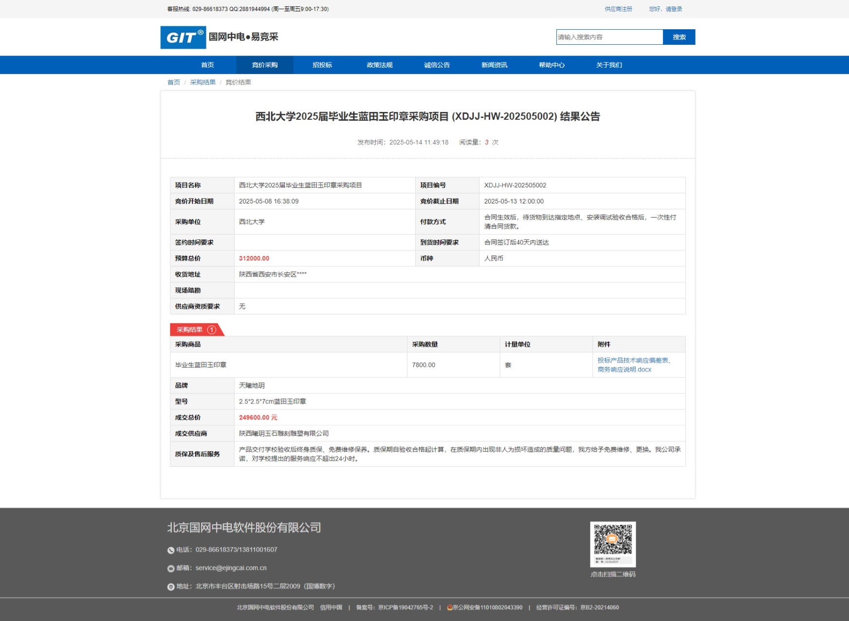 必赢3003no1线路检测中心2025届毕业生蓝田玉印章采购项目 (XDJJ-HW-202505002) 竞价结果公告