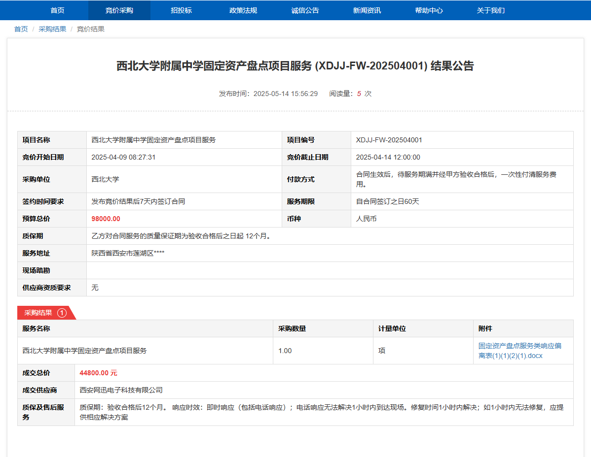 必赢3003no1线路检测中心附属中学固定资产盘点项目服务(XDJJ-FW-202504001)竞价结果公告 作者:采购与招标办公室 编辑: 时间:2025-05-14 原公告链接:https://www.ejingcai.com.cn/site/bidding/detail/18218