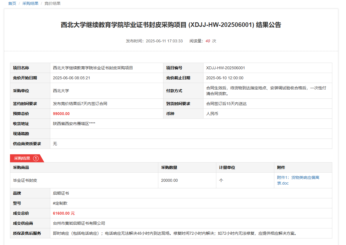 必赢3003no1线路检测中心继续教育学院毕业证书封皮采购项目(XDJJ-HW-202506001)竞价结果公告 作者:采购与招标办公室 编辑: 时间:2025-06-12 原公告链接:https://www.ejingcai.com.cn/site/bidding/detail/18846