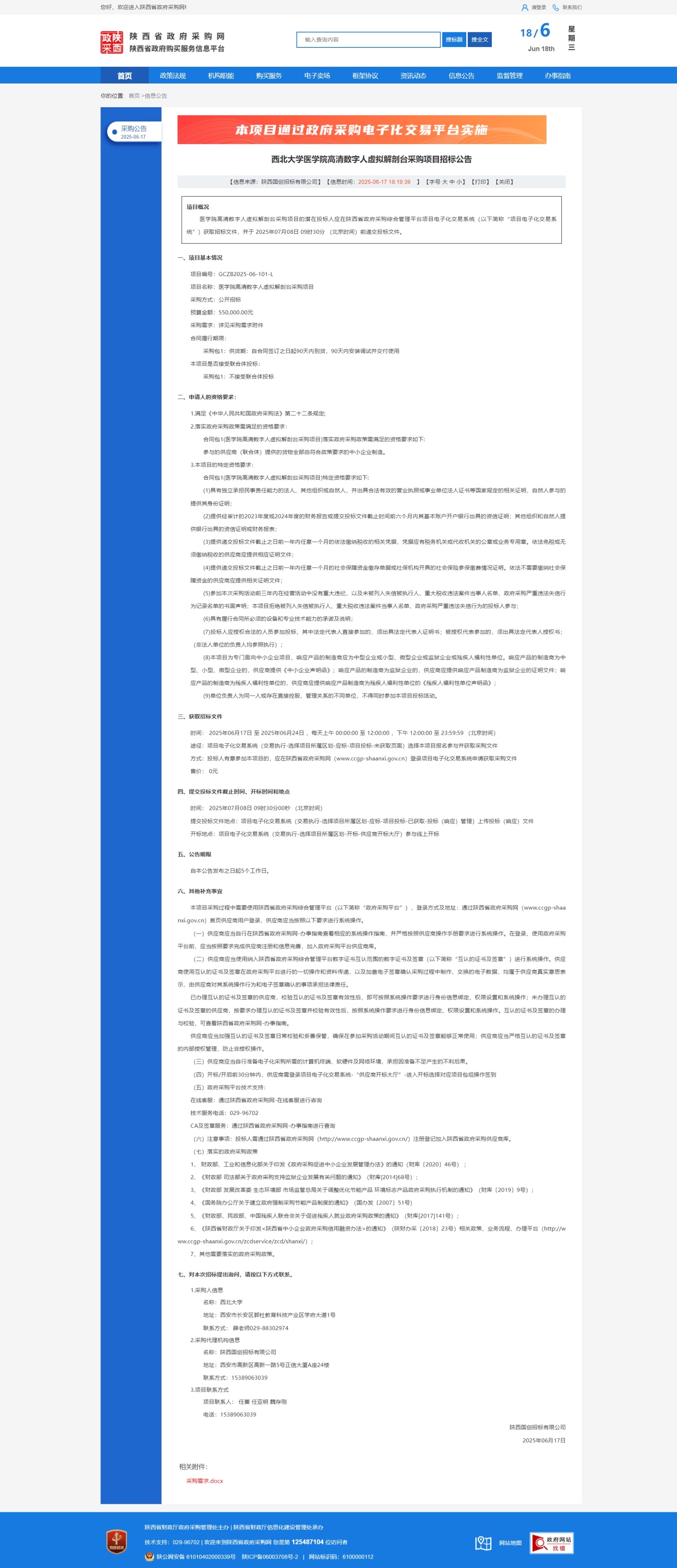 必赢3003no1线路检测中心医学院高清数字人虚拟解剖台采购项目招标公告 作者: 编辑:采购与招标办公室 时间:2025-06-18 原公告链接:https://www.ccgp-shaanxi.gov.cn/freecms/site/shaanxi/ggxx/info/2025/8a69c0a29672060001977d5b25b77c33.html?noticeType=001011¬iceId=8a96e29e-4b66-11f0-8063-08c0eb20c666