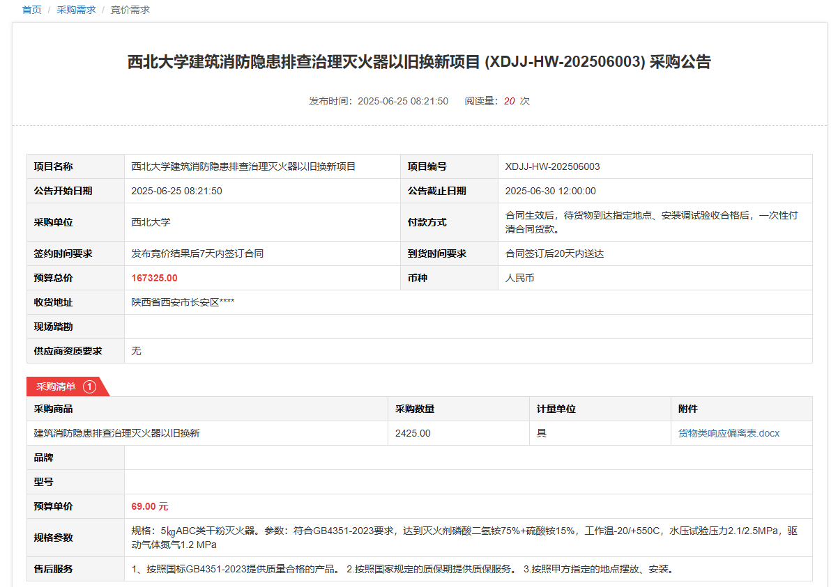 必赢3003no1线路检测中心建筑消防隐患排查治理灭火器以旧换新项目(XDJJ-HW-202506003)竞价采购公告 作者:采购与招标办公室 编辑: 时间:2025-06-25 原公告链接:https://www.ejingcai.com.cn/site/bidding/detail/19167