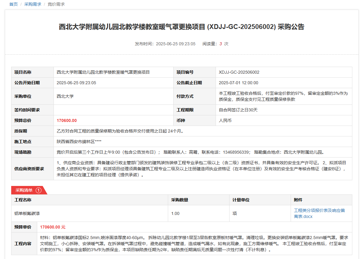 必赢3003no1线路检测中心附属幼儿园北教学楼教室暖气罩更换项目(XDJJ-GC-202506002)竞价采购公告