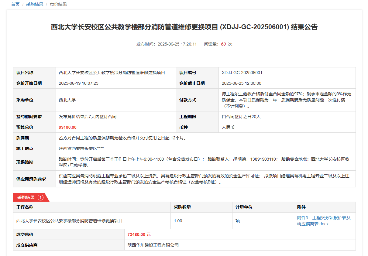 必赢3003no1线路检测中心长安校区公共教学楼部分消防管道维修更换项目(XDJJ-GC-202506001)竞价结果公告