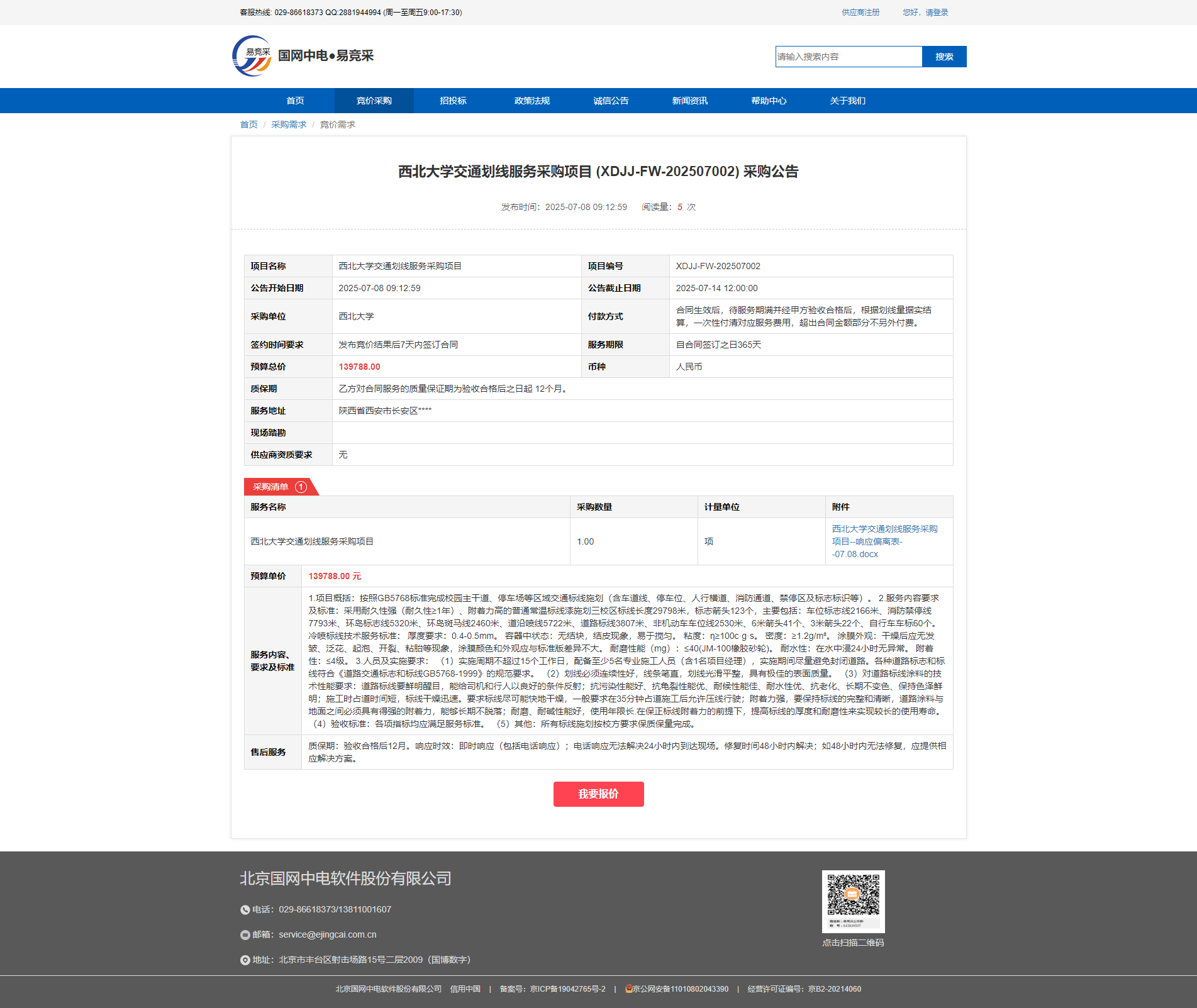 必赢3003no1线路检测中心交通划线服务采购项目 (XDJJ-FW-202507002) 采购公告