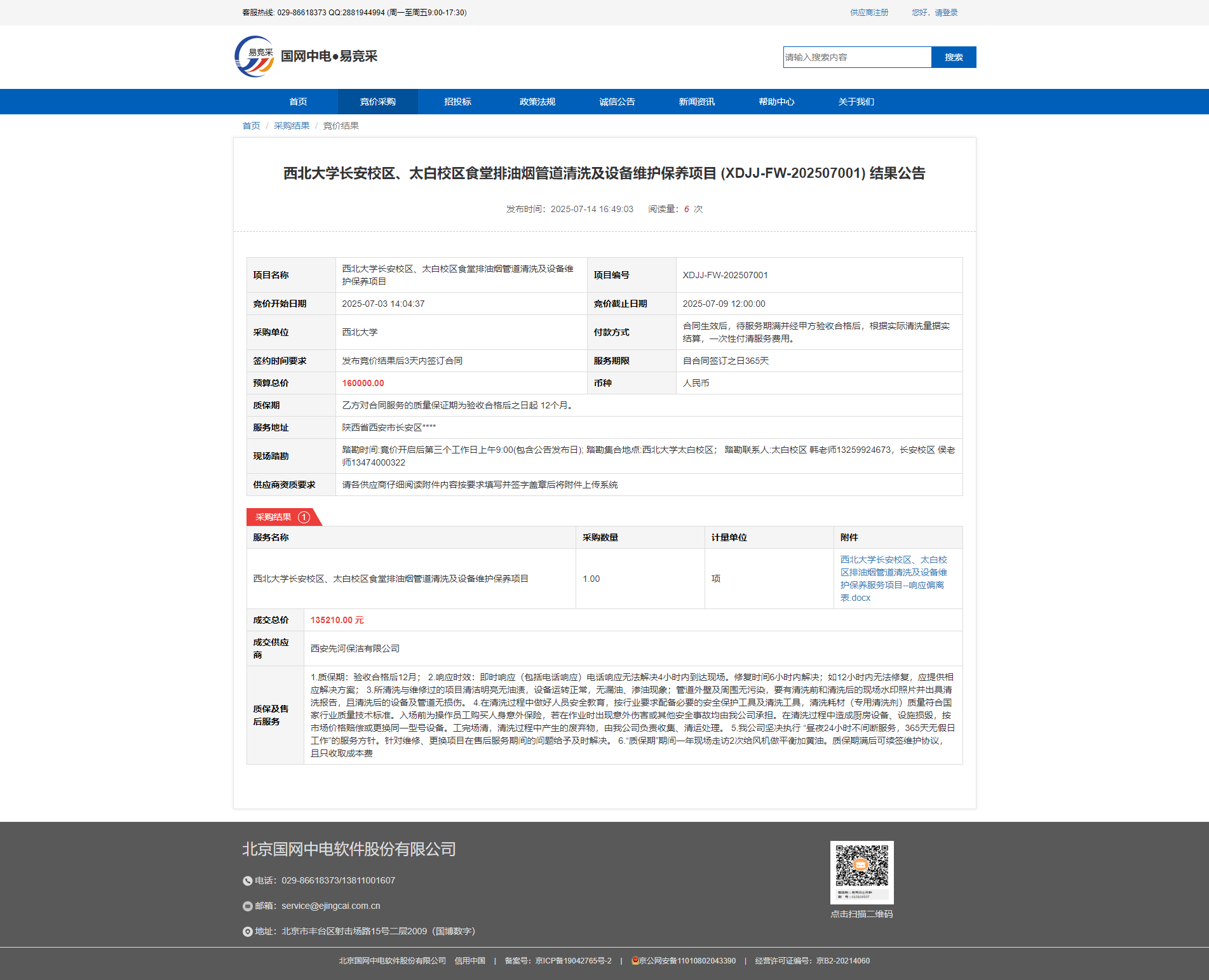 必赢3003no1线路检测中心长安校区、太白校区食堂排油烟管道清洗及设备维护保养项目 (XDJJ-FW-202507001) 结果公告
