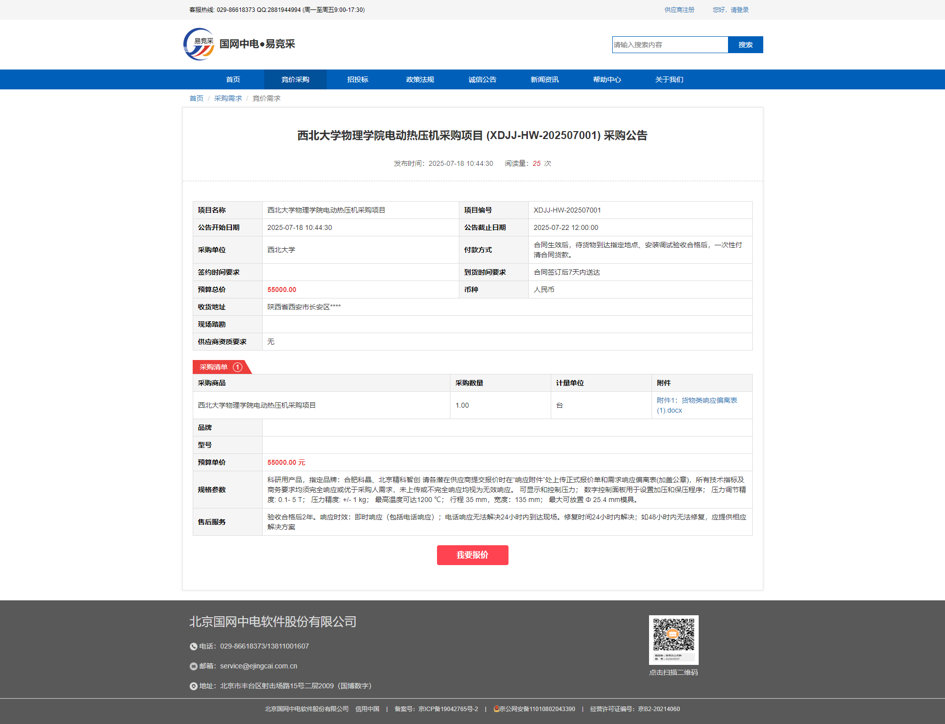 必赢3003no1线路检测中心物理学院电动热压机采购项目(XDJJ-HW-202507001)竞价采购公告