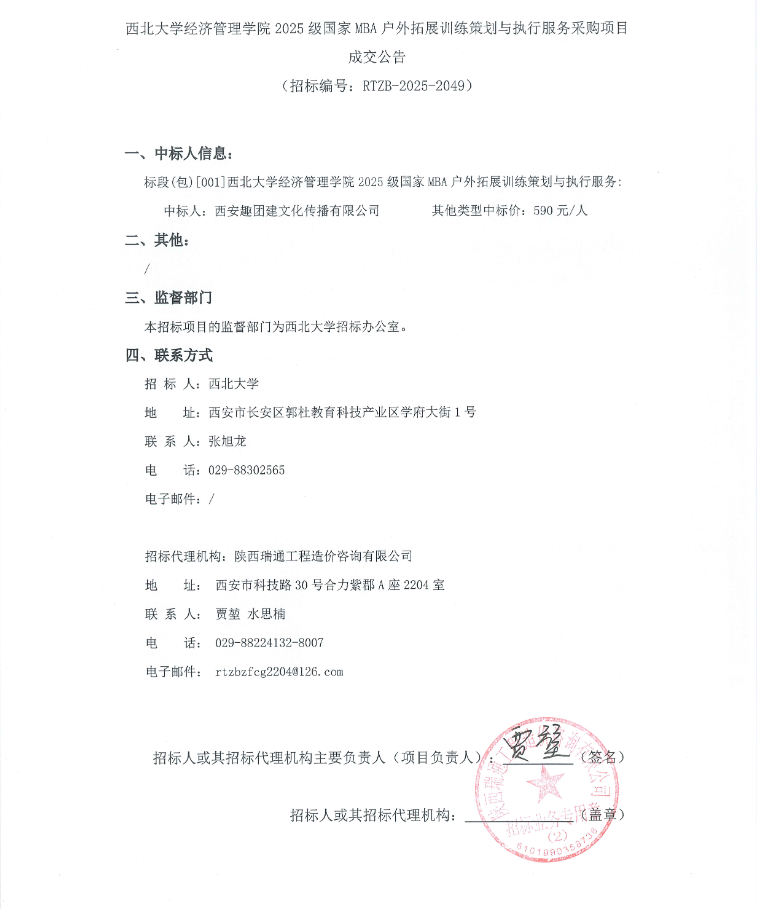 必赢3003no1线路检测中心经济管理学院2025级国家MBA户外拓展训练策划与执行服务采购项目成交公告