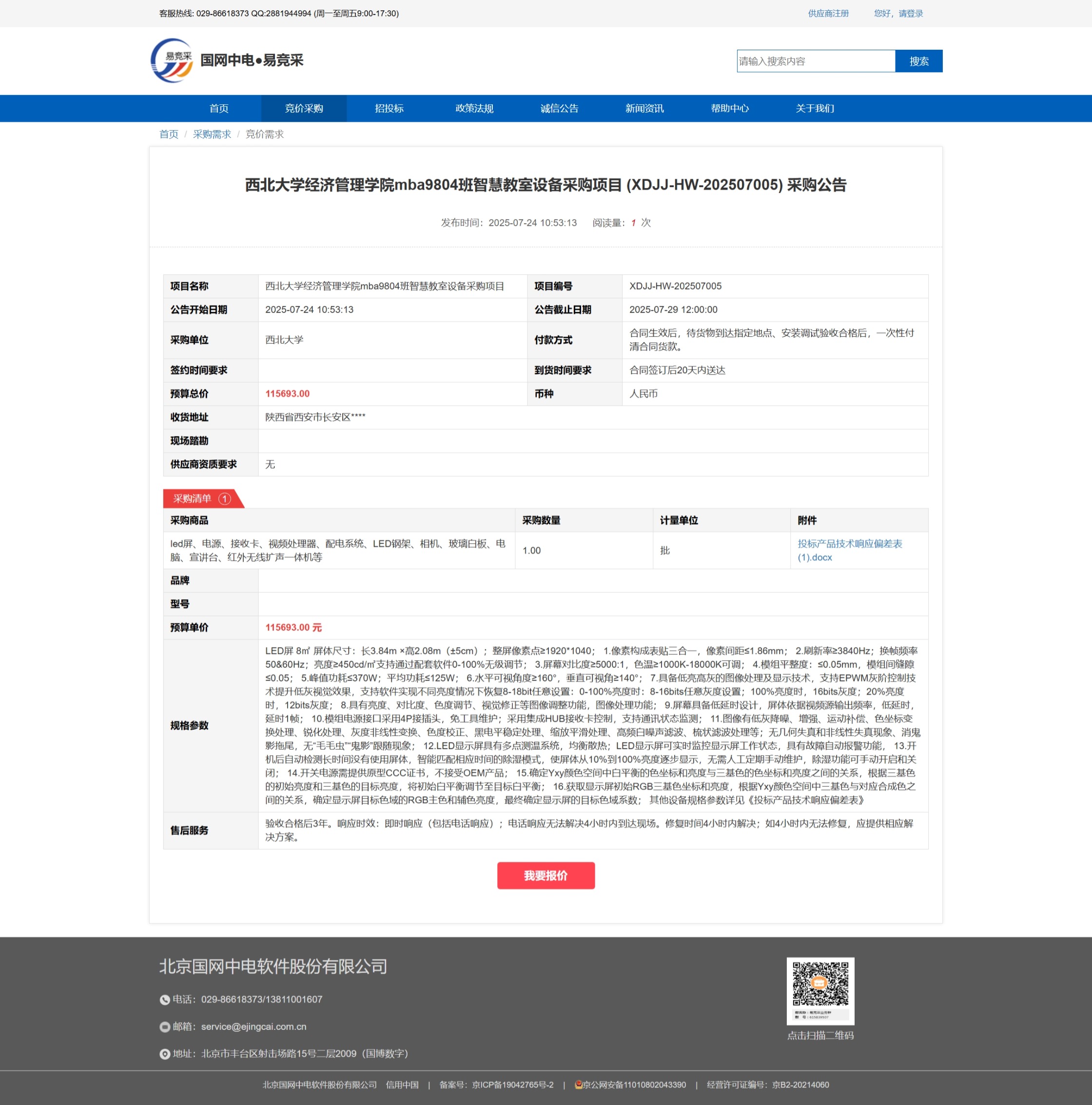 必赢3003no1线路检测中心经济管理学院mba9804班智慧教室设备采购项目 (XDJJ-HW-202507005)竞价采购公告