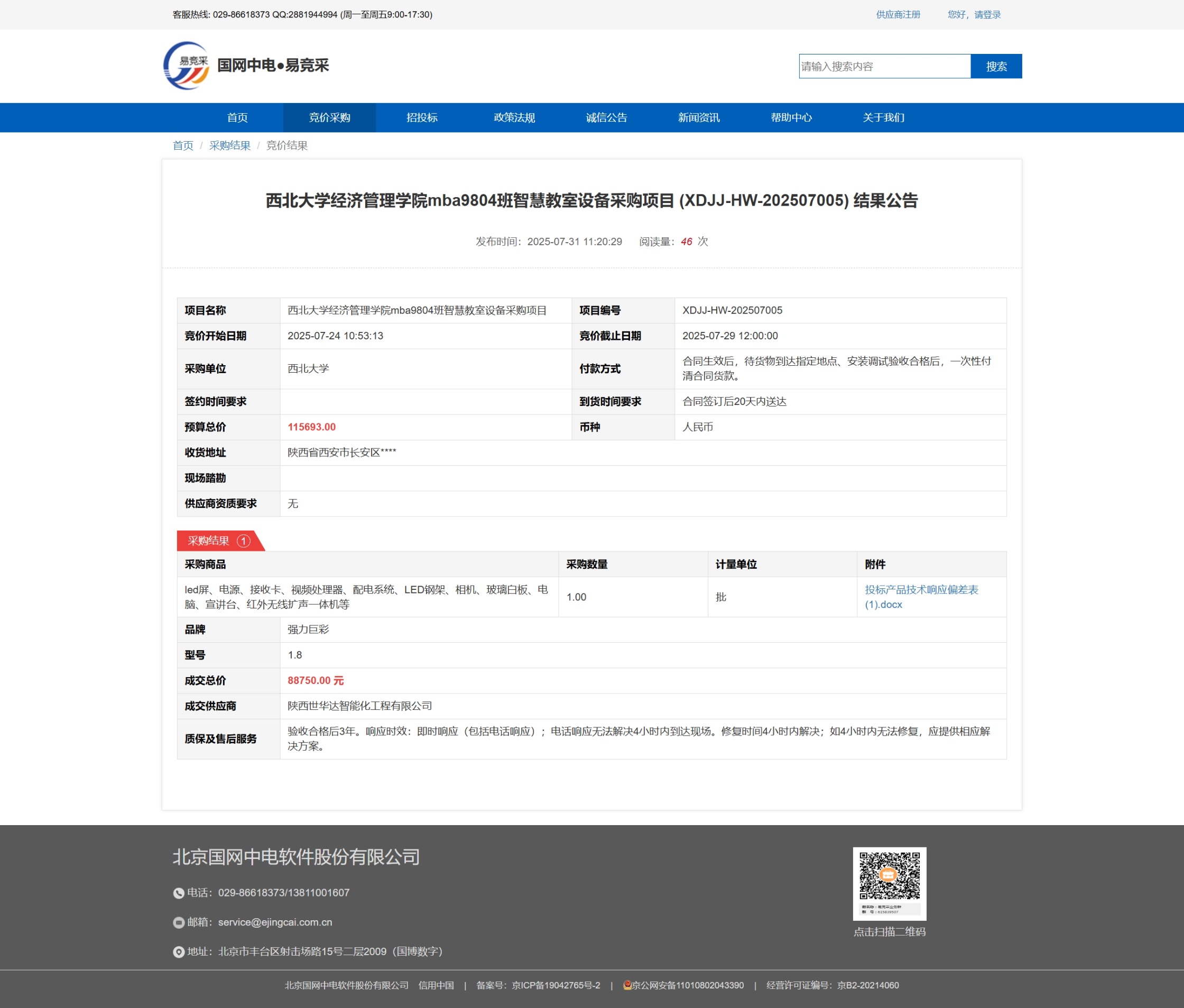 必赢3003no1线路检测中心经济管理学院mba9804班智慧教室设备采购项目 (XDJJ-HW-202507005) 竞价结果公告 作者: 编辑:采购与招标办公室 时间:2025-07-31 原公告链接:https://www.ejingcai.com.cn/site/bidding/detail/19832