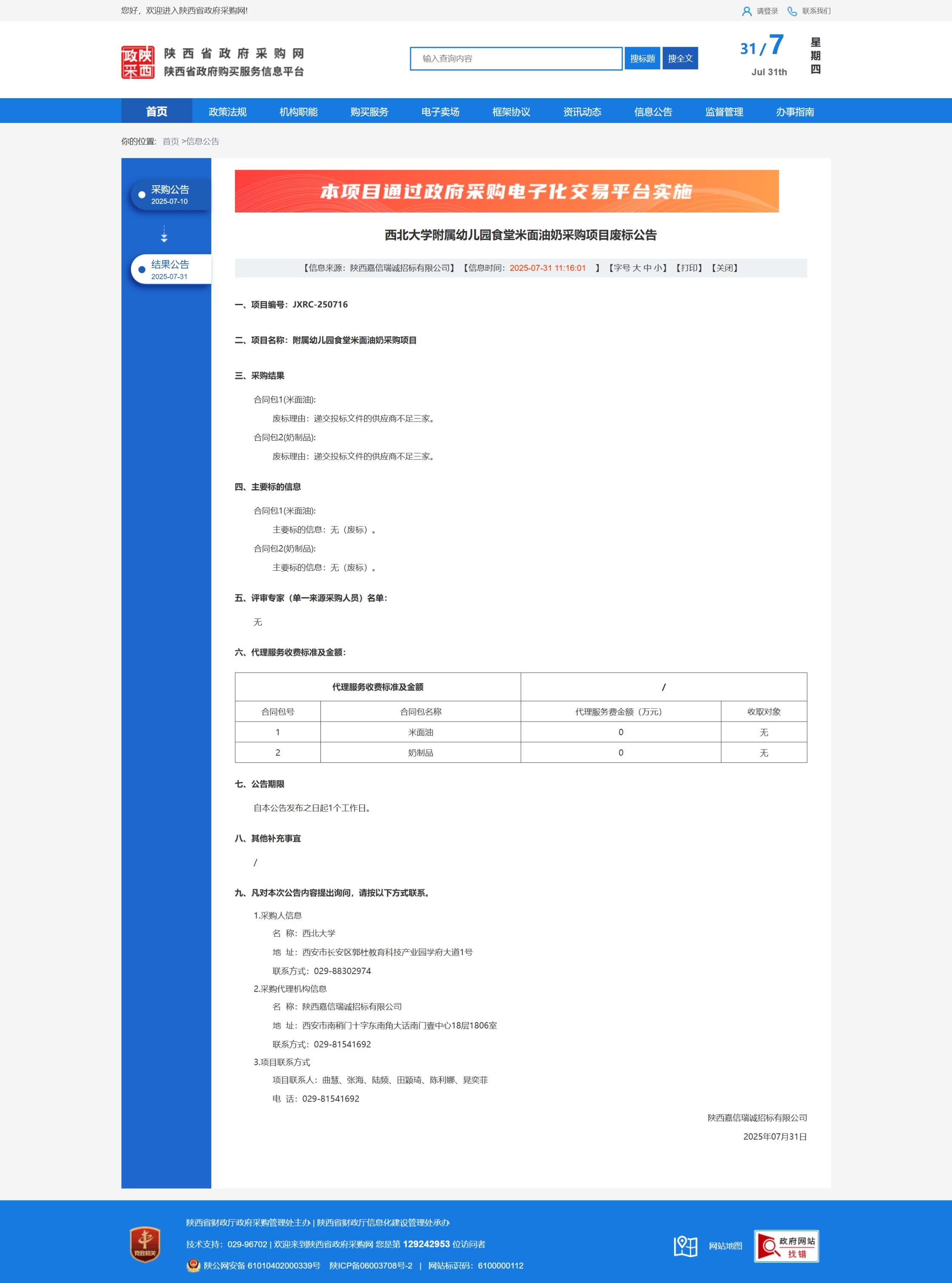 必赢3003no1线路检测中心附属幼儿园食堂米面油奶采购项目废标公告 作者: 编辑:采购与招标办公室 时间:2025-07-31 原公告链接:https://www.ccgp-shaanxi.gov.cn/freecms/site/shaanxi/ggxx/info/2025/8a69c0c7985e48f501985e6d02b81fb9.html?noticeType=001006¬iceId=b9835470-6dbe-11f0-8063-08c0eb20c666