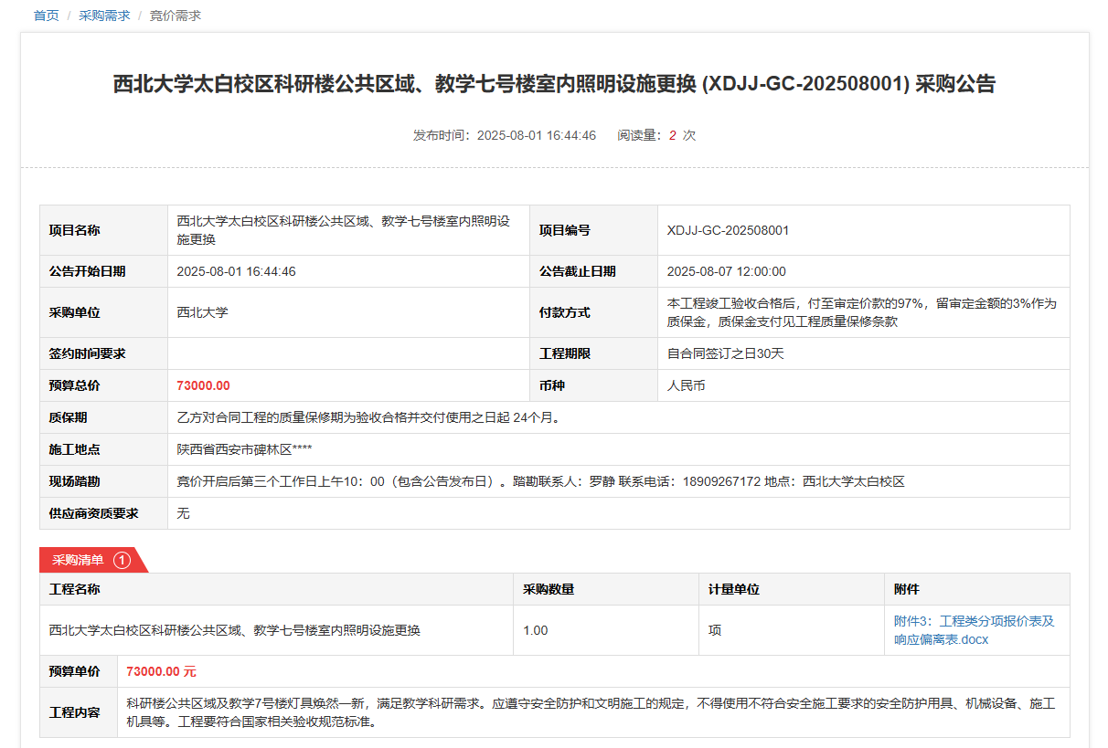 必赢3003no1线路检测中心太白校区科研楼公共区域、教学七号楼室内照明设施更换(XDJJ-GC-202508001)竞价采购公告 作者:采购与招标办公室 编辑: 时间:2025-08-01 原公告链接