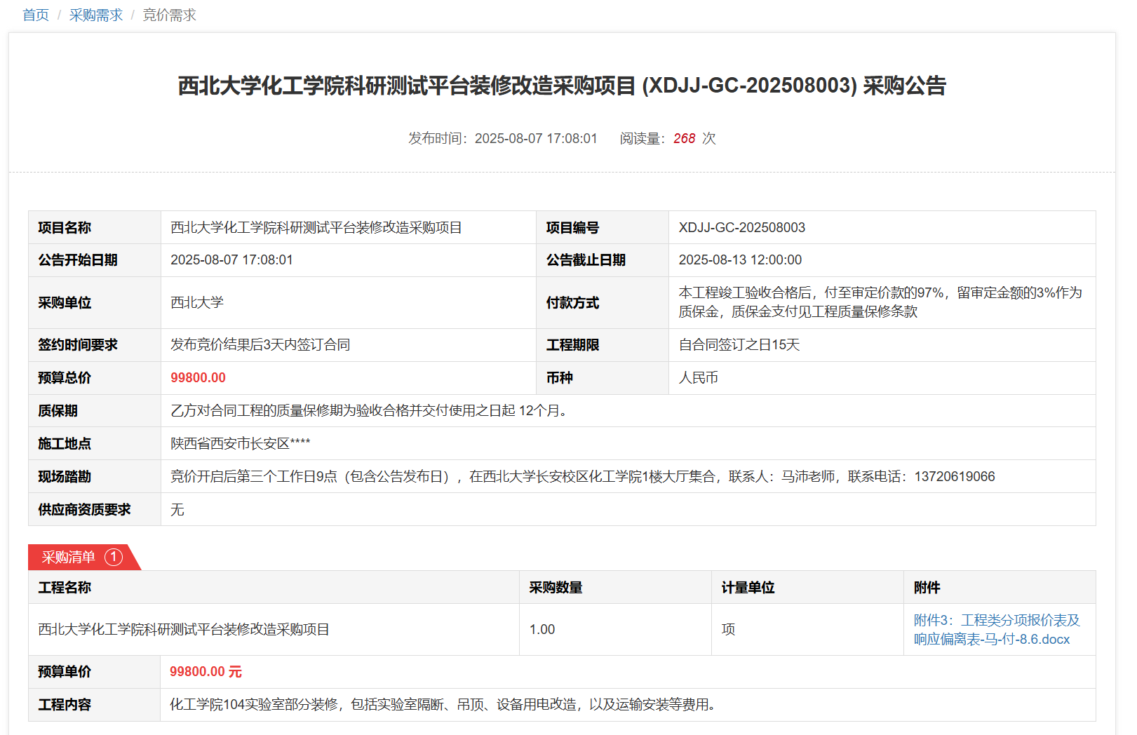必赢3003no1线路检测中心化工学院科研测试平台装修改造采购项目(XDJJ-GC-202508003)竞价采购公告