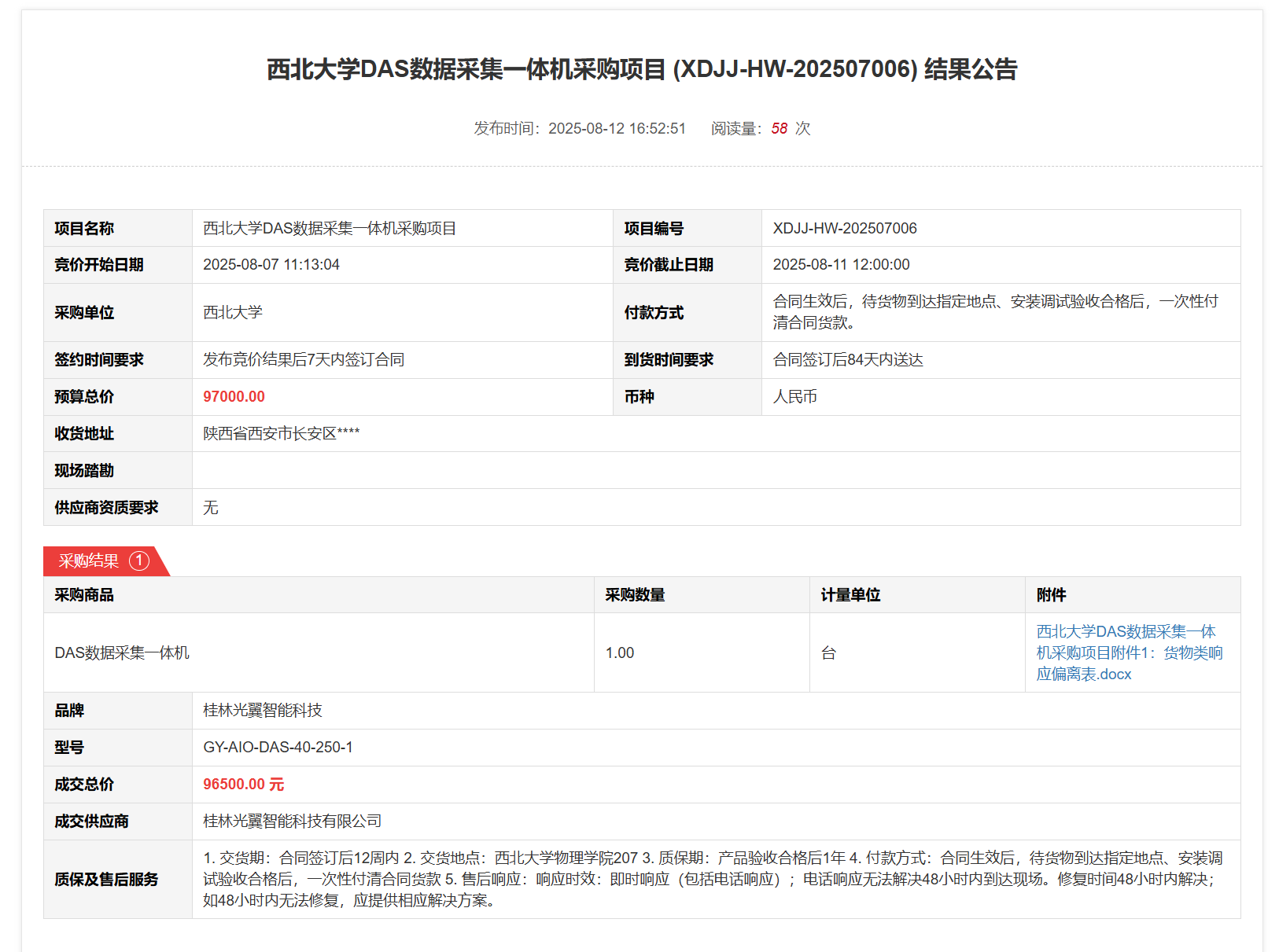 必赢3003no1线路检测中心DAS数据采集一体机采购项目(XDJJ-HW-202507006)竞价结果公告
