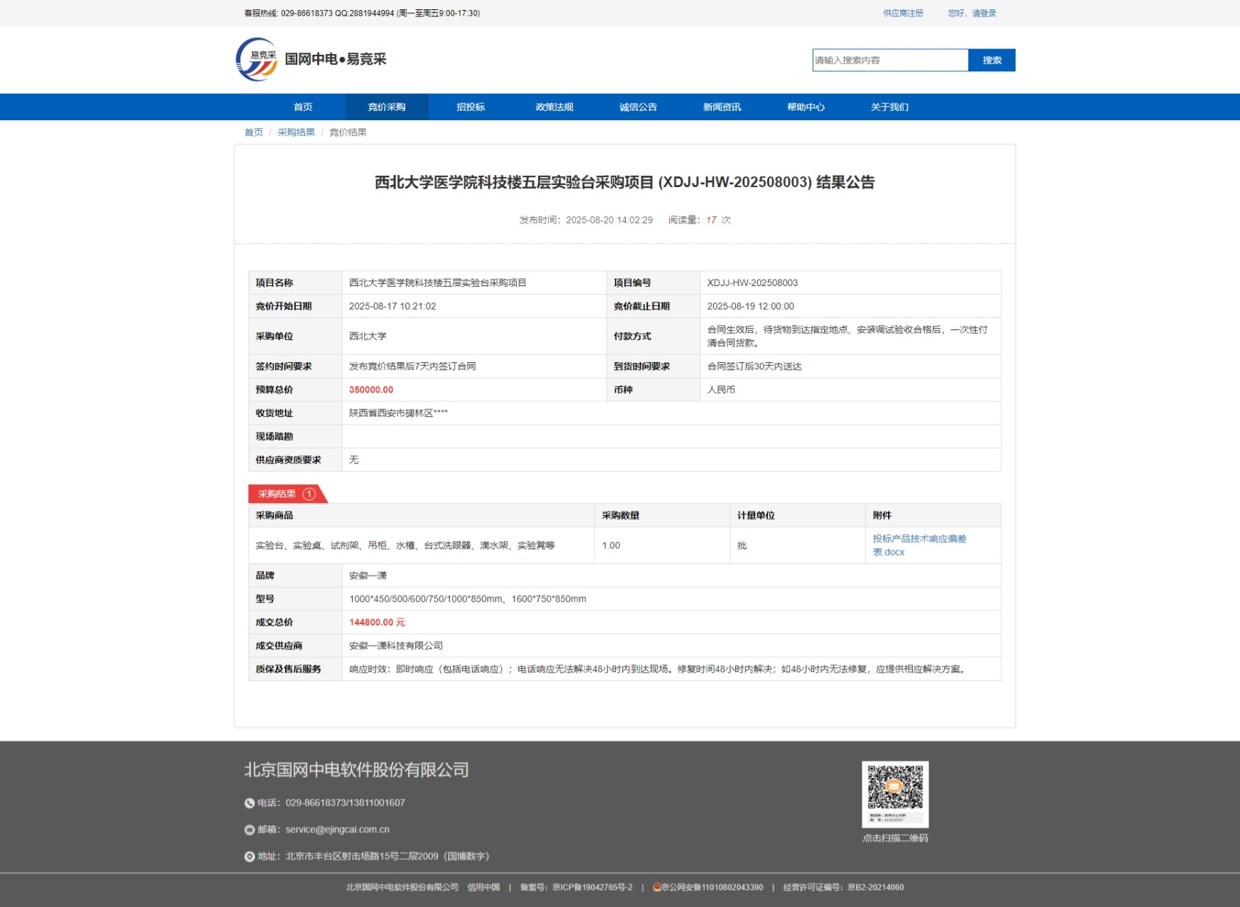 必赢3003no1线路检测中心医学院科技楼五层实验台采购项目 (XDJJ-HW-202508003) 结果公告 作者: 编辑:采购与招标办公室 时间:2025-08-20 原公告链接:https://www.ejingcai.com.cn/site/bidding/detail/20040
