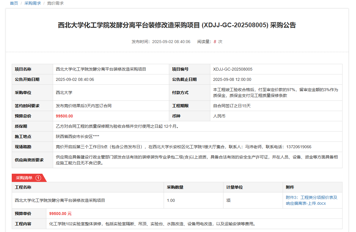 必赢3003no1线路检测中心化工学院发酵分离平台装修改造采购项目(XDJJ-GC-202508005)竞价采购公告