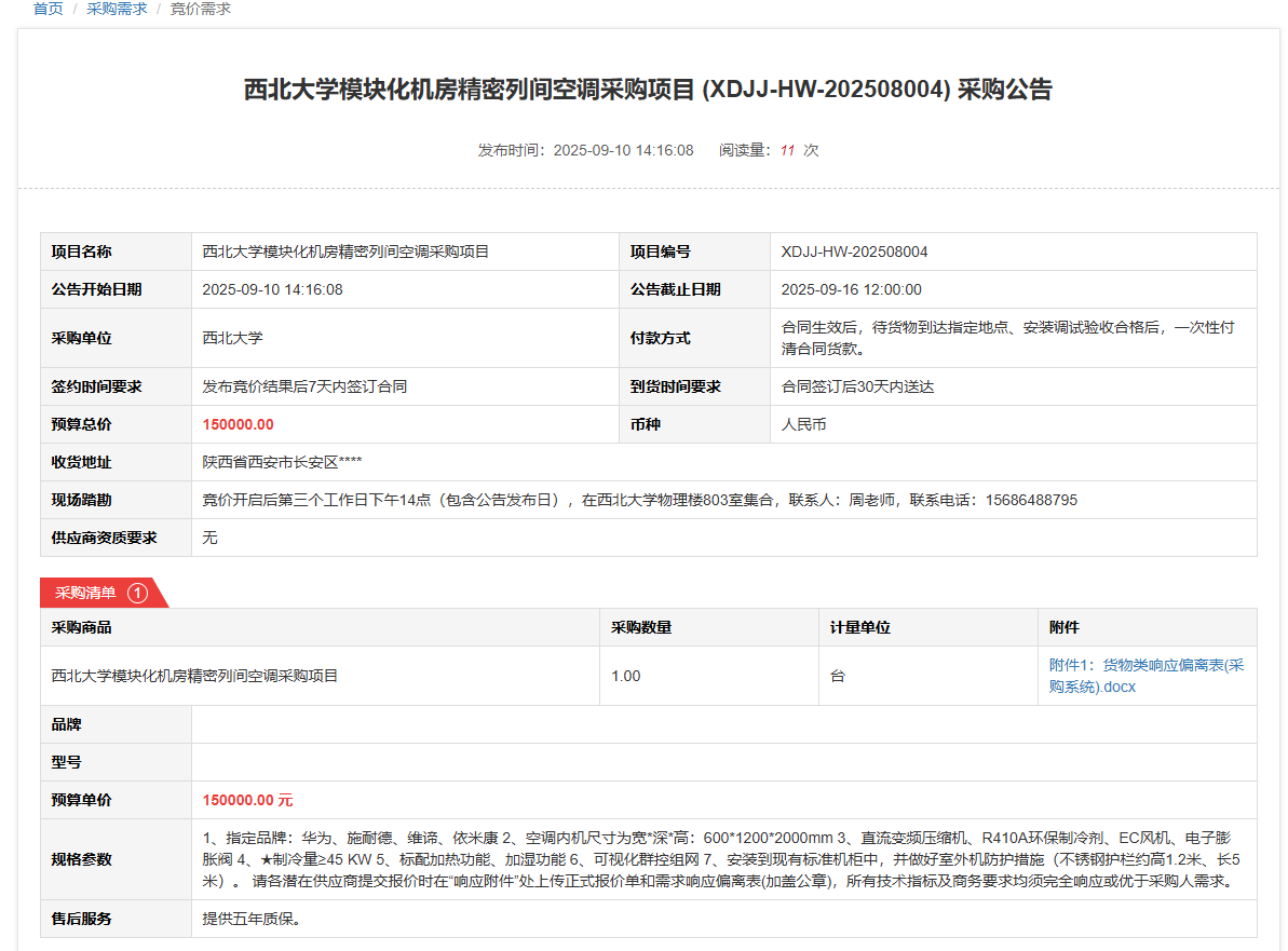 必赢3003no1线路检测中心模块化机房精密列间空调采购项目(XDJJ-HW-202508004)竞价采购公告