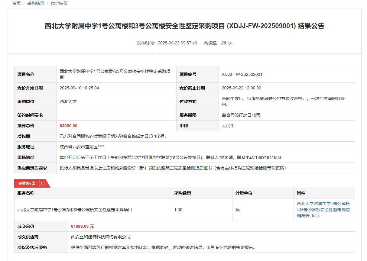 必赢3003no1线路检测中心附属中学1号公寓楼和3号公寓楼安全性鉴定采购项目(XDJJ-FW-202509001)竞价结果公告