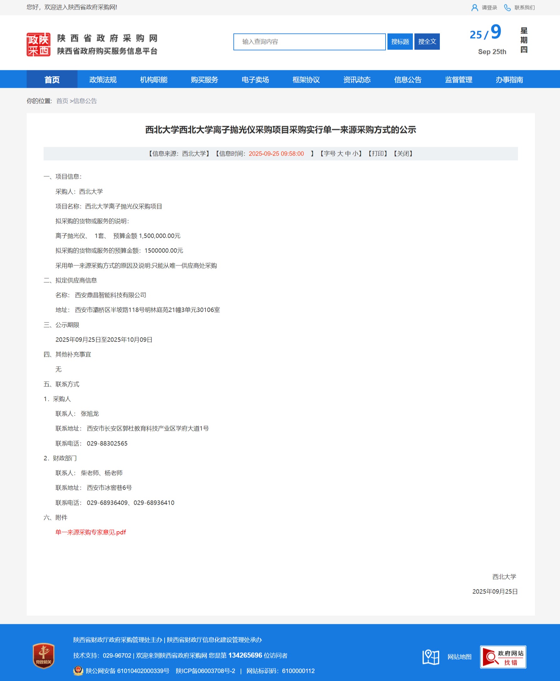 必赢3003no1线路检测中心离子抛光仪采购项目实行单一来源采购方式的公示