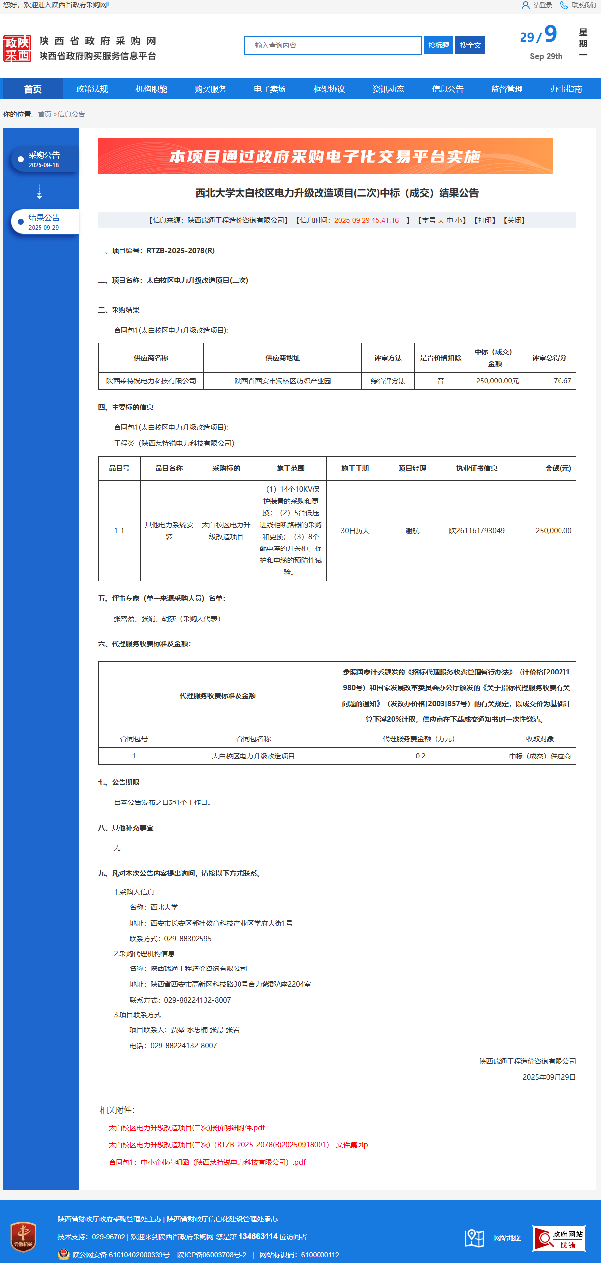 必赢3003no1线路检测中心太白校区电力升级改造项目(二次)中标(成交)结果公告