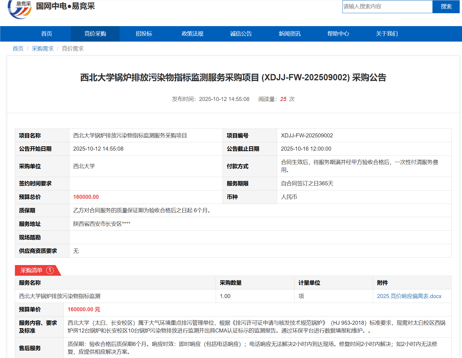 必赢3003no1线路检测中心锅炉排放污染物指标监测服务采购项目(XDJJ-FW-202509002)竞价采购公告