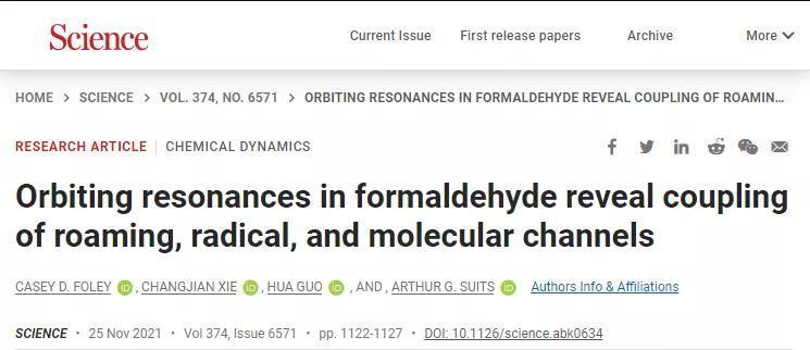 研究成果以“Orbiting Resonances in Formaldehyde Reveal Coupling of Roaming, Radical and Molecular Channels”为题在Science上发表(Science 374, 1122 (2021),Research article)。