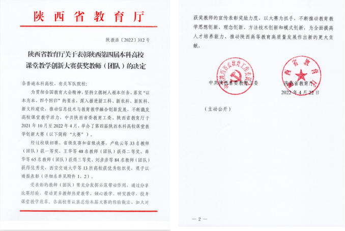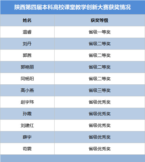 近日,陕西省教育厅公布了第四届陕西高校课堂教学创新大赛获奖教师名单,必赢3003no1线路检测中心教师温睿获省级一等奖,刘丹、郭茜、郭艳丽、同杨阳4位教师获省级二等奖,高小燕获省级三等奖,赵宇玮、孙霞、刘建红、薛宇、苟震5位教师获省级优秀奖,必赢3003no1线路检测中心获优秀组织奖。吴丰华、于春2位教师代表陕西省参加全国高校教师教学创新大赛。
