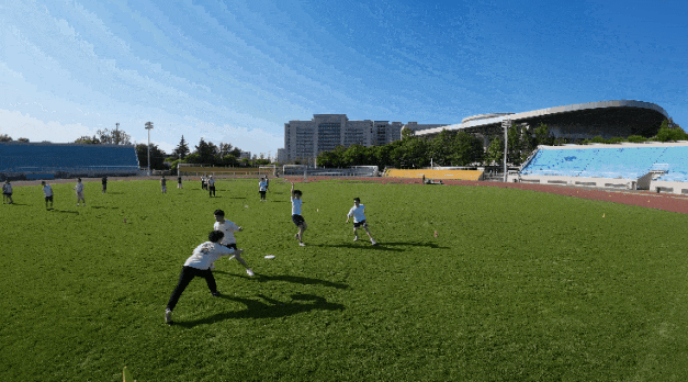 与此同时,作为一项要求高度团队合作的运动,组队训练是飞盘课的“标配”,同学们相互配合,多人一组,顺序接盘、折返跑接盘、假动作……各种考验团队合作和应变能力的实战训练在西操场有序进行,一个漂亮的传接盘引起欢呼阵阵,一个失误的飞盘弧线又让人忍俊不禁,在飞盘课上,骄阳和青春的面庞相得益彰。
