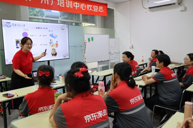 华南师范大学 为提升全社会的普通话使用水平,增强民族凝聚力和文化认同感,华南师范大学策划举办推普周系列活动,在京东家政(广州)培训中心开展普通话培训。基地志愿服务队线下授课,结合家政行业特点和从业人员实际需求,制订贴近生活和工作场景的教学方案,分两周授课。第一周的教学主要讲解学习普通话的重要性,帮助家政阿姨纠正方言口音、掌握普通话准确发音,在真实情境中提升普通话的运用能力。第二周的课程中,团队根据家政服务常见场景创建小剧场,通过情景模拟,让家政阿姨在轻松愉快的氛围中学习实用的日常表达,提升语言运用的灵活性。课程还针对家政行业的服务礼仪进行详细讲解和生动示范。