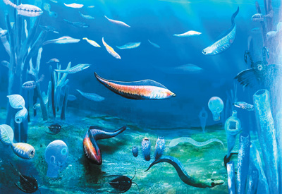 然而,在距今5.6亿—5.18亿年前的大约4200万年间,发生了整个生命史上最为壮观的生物创新事件——寒武纪大爆发,即在不到地球历史1%的时间内诞生了90%的动物门类。大量的动物化石为追溯动物进化和人类远祖提供了重要标本。前面提到的凤姣昆明鱼,就生活在寒武纪大爆发巅峰时期。