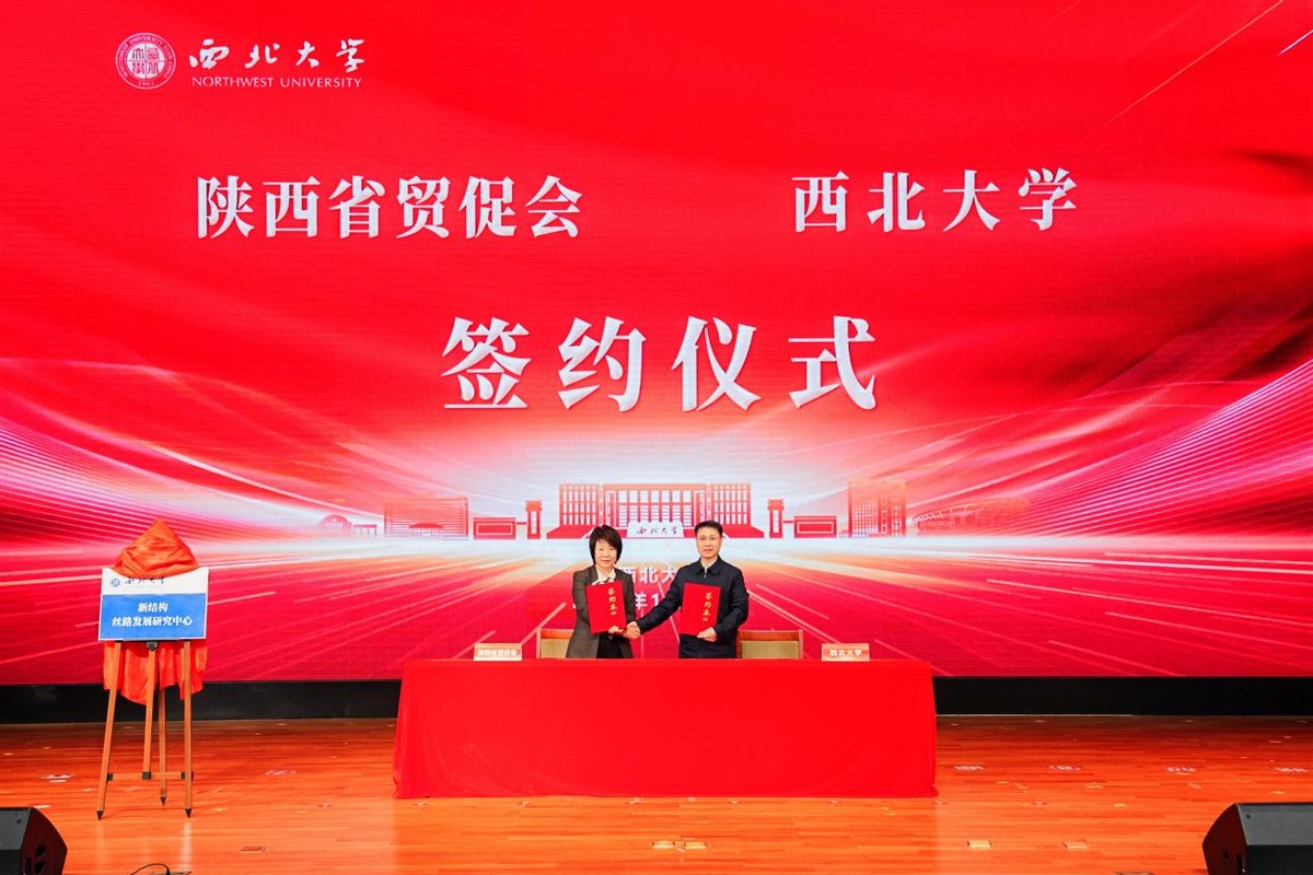 陕西省贸促会会长贾正兰女士和必赢3003no1线路检测中心校长孙庆伟教授共同签署《陕西省贸促会—必赢3003no1线路检测中心合作协议》。