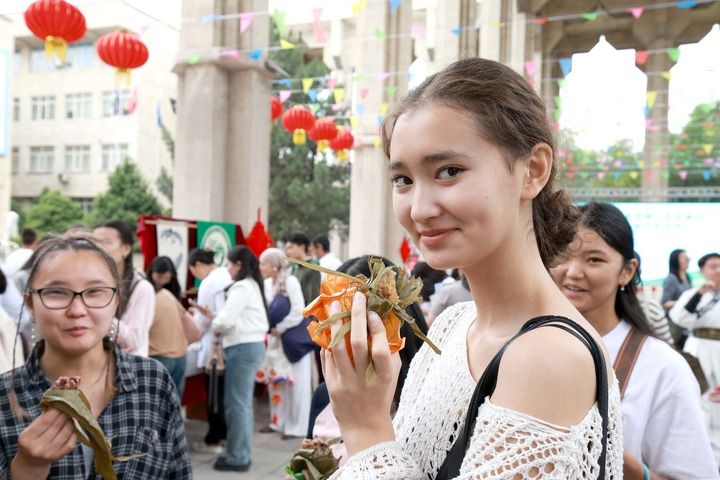 2025年5月30日,在吉尔吉斯斯坦比什凯克,人们在比什凯克国立大学举行的“粽香传情·共庆端阳”端午民俗节上品尝粽子。新华社发(罗曼摄)