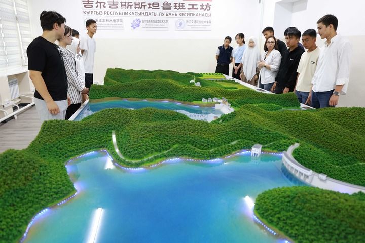 2025年6月4日,在吉尔吉斯斯坦首都比什凯克,师生在吉尔吉斯斯坦鲁班工坊水利枢纽工程模拟演示实验室学习水电站知识。新华社发(罗曼摄)