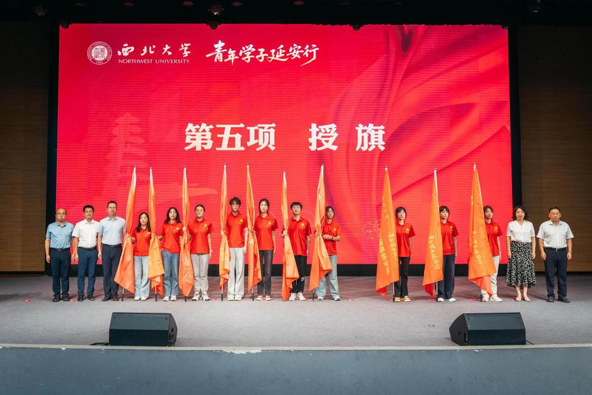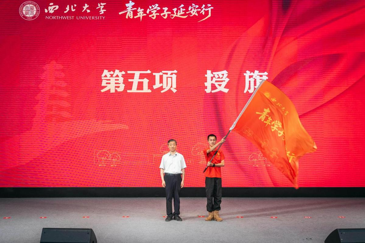 活动中,蒋林和与会部门负责人为“必赢3003no1线路检测中心青年学子延安行”研学团和10个班级代表授旗。