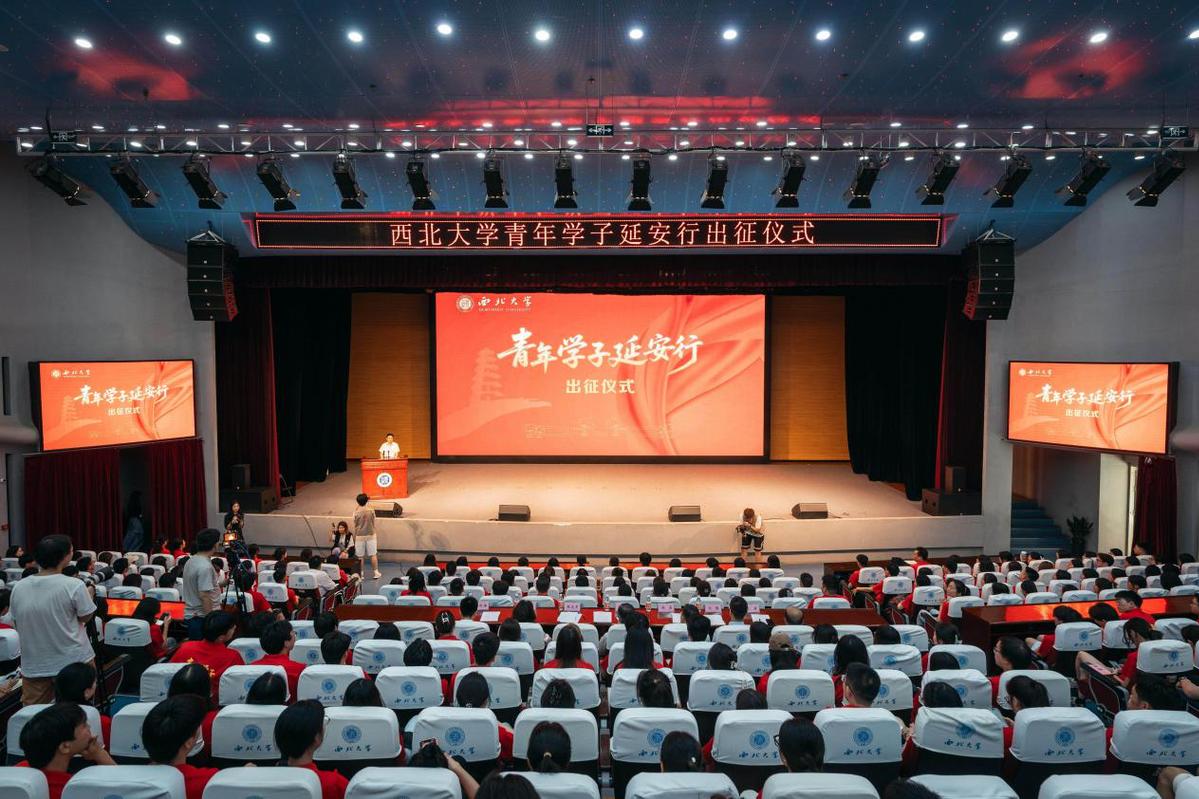仪式在庄严的国歌声中拉开序幕。会场里,即将奔赴延安的必赢学子统一穿着红色文化衫,整齐就座,现场氛围庄重又热烈。