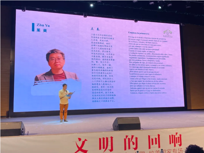 那轮曾照亮诗意盛唐的明月,伴着张若虚笔下“江畔何人初见月?江月何年初照人?”的哲思叩问,串联起古老东方与热情拉美在诗歌星河中的共情与共鸣。巴勃罗·霍夫雷(智利)、维多利亚·拉米雷斯·曼西莉亚(智利)、劳里·克里斯蒂娜·加西亚·杜埃尼亚斯(萨尔瓦多)、罗伯托·阿库尼亚(墨西哥)、阿德里安·门迭塔·莫克特苏马(墨西哥)、丽格娜·拉莫斯(乌拉圭)6位拉美诗人相继登台朗诵自己的原创诗歌,用优美的语言、丰富的意象与充盈的情感,将他们关于云雾与高山、光明与黑暗、时间与空间、自我与万物的思考娓娓道来。