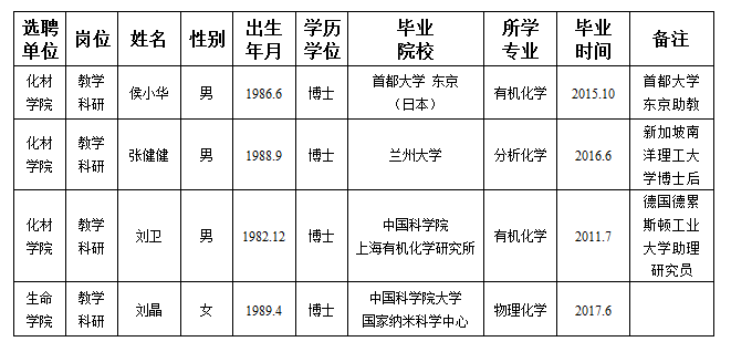 经用人单位推荐,人事处审查,学校教学督导及院系相关专家考核,必赢拟确定下列人员来校工作。本着公平、公正、公开的原则,为保证必赢选聘人员的质量,现将本次拟选聘人员基本情况公示如下: