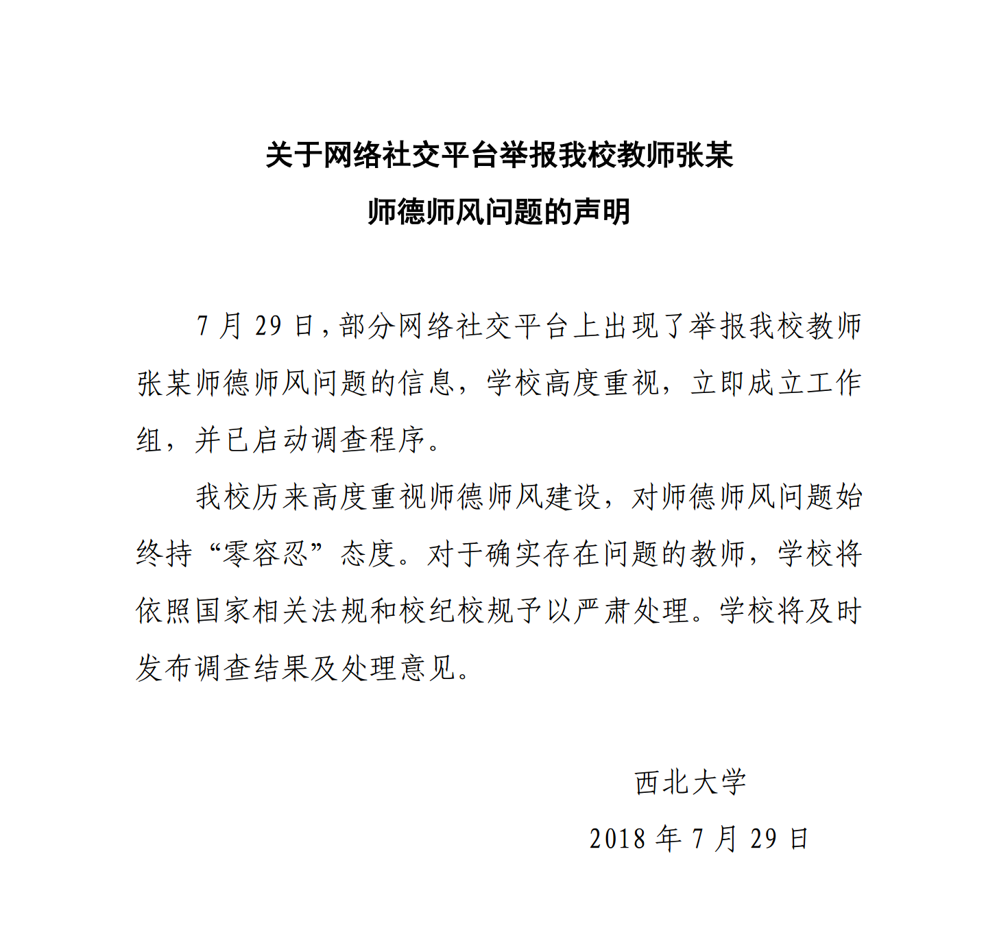 关于网络社交平台举报必赢教师张某师德师风问题的声明