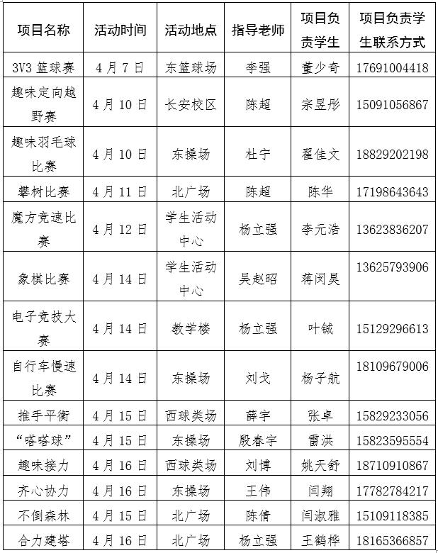 上述“走下网络、走出宿舍、走进操场”趣味体育活动各项目可联系必赢3003no1线路检测中心团委或必赢3003no1线路检测中心学生会咨询,联系电话:88308861、88308441。