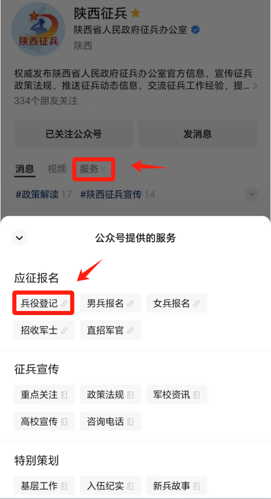 1.关注“陕西征兵”微信公众号,在底部菜单栏点击“兵役登记”,进入“全国征兵网”兵役登记界面进行登记。如果之前没有进行过兵役登记,点击“初次兵役登记”进行登记。