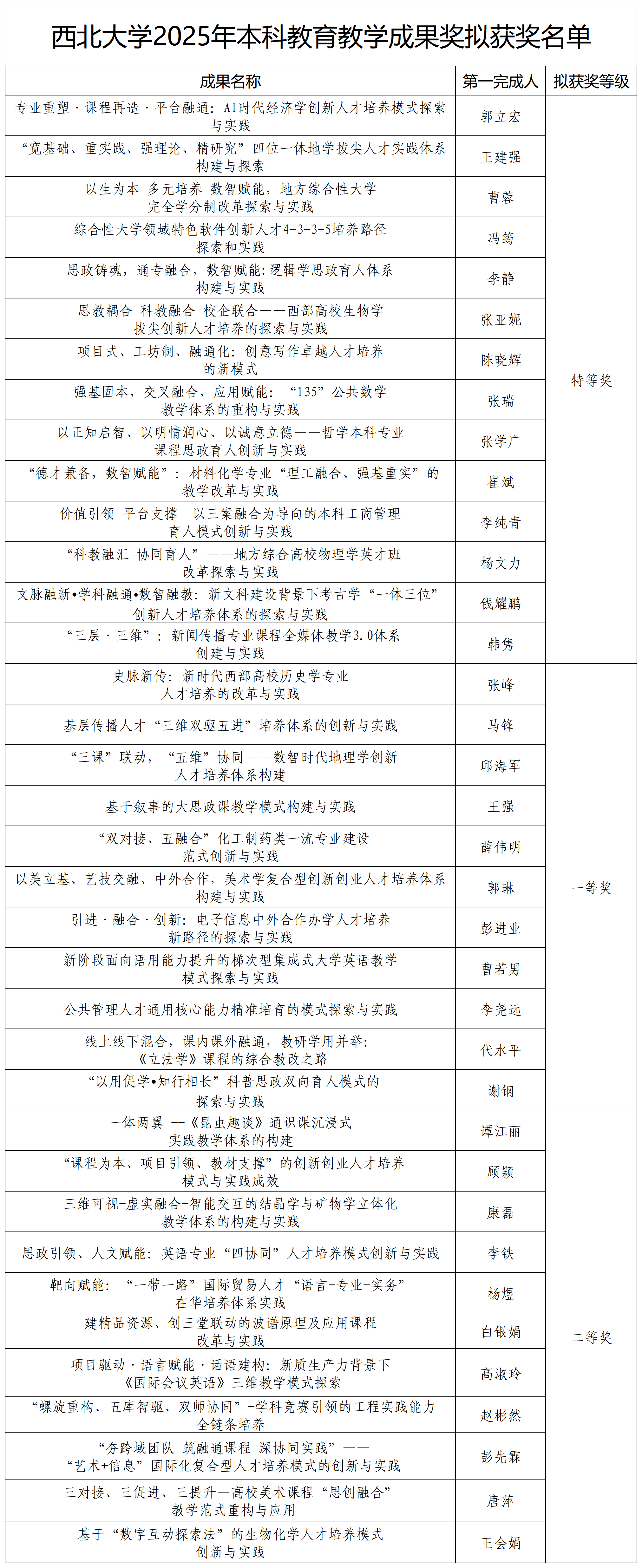 根据《必赢3003no1线路检测中心关于开展2025年本科教育教学成果奖评选工作的通知》(必赢教〔2025〕19号)要求,经个人申报、单位推荐与专家评审,拟确定“专业重塑·课程再造·平台融通:AI时代经济学创新人才培养模式探索与实践”等14项成果获特等奖,“史脉新传:新时代西部高校历史学专业人才培养的改革与实践”等11项成果获一等奖,“一体两翼-《昆虫趣谈》通识课沉浸式实践教学体系构建”等11项成果获二等奖。同时,将依序推荐参加陕西省2025年本科教育教学成果奖评选。现将拟获奖名单予以公示,公示期为2025年9月8日-12日。公示期任何单位或个人有异议,请实名以书面形式向教务处反映。