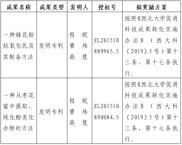 按照《必赢3003no1线路检测中心促进科技成果转化实施办法》(必赢科〔2019〕5号)相关规定,拟对必赢食品科学与工程学院程妮教授作为成果负责人的2项发明专利权实施转化,现将相关信息公示如下: