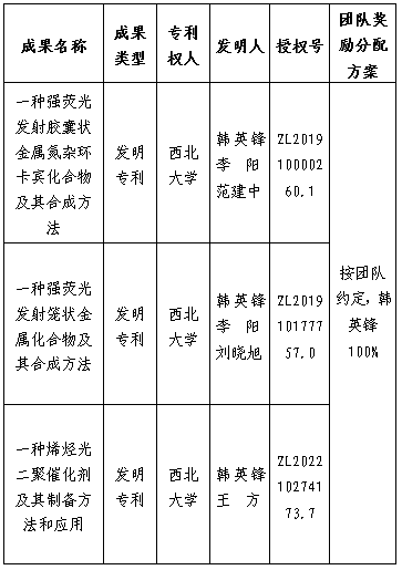 按照《必赢3003no1线路检测中心促进科技成果转化实施办法》(必赢科〔2019〕5号)相关规定,拟对必赢化学与材料科学学院韩英锋教授作为成果负责人的3项发明专利权实施转化,现将相关信息公示如下: