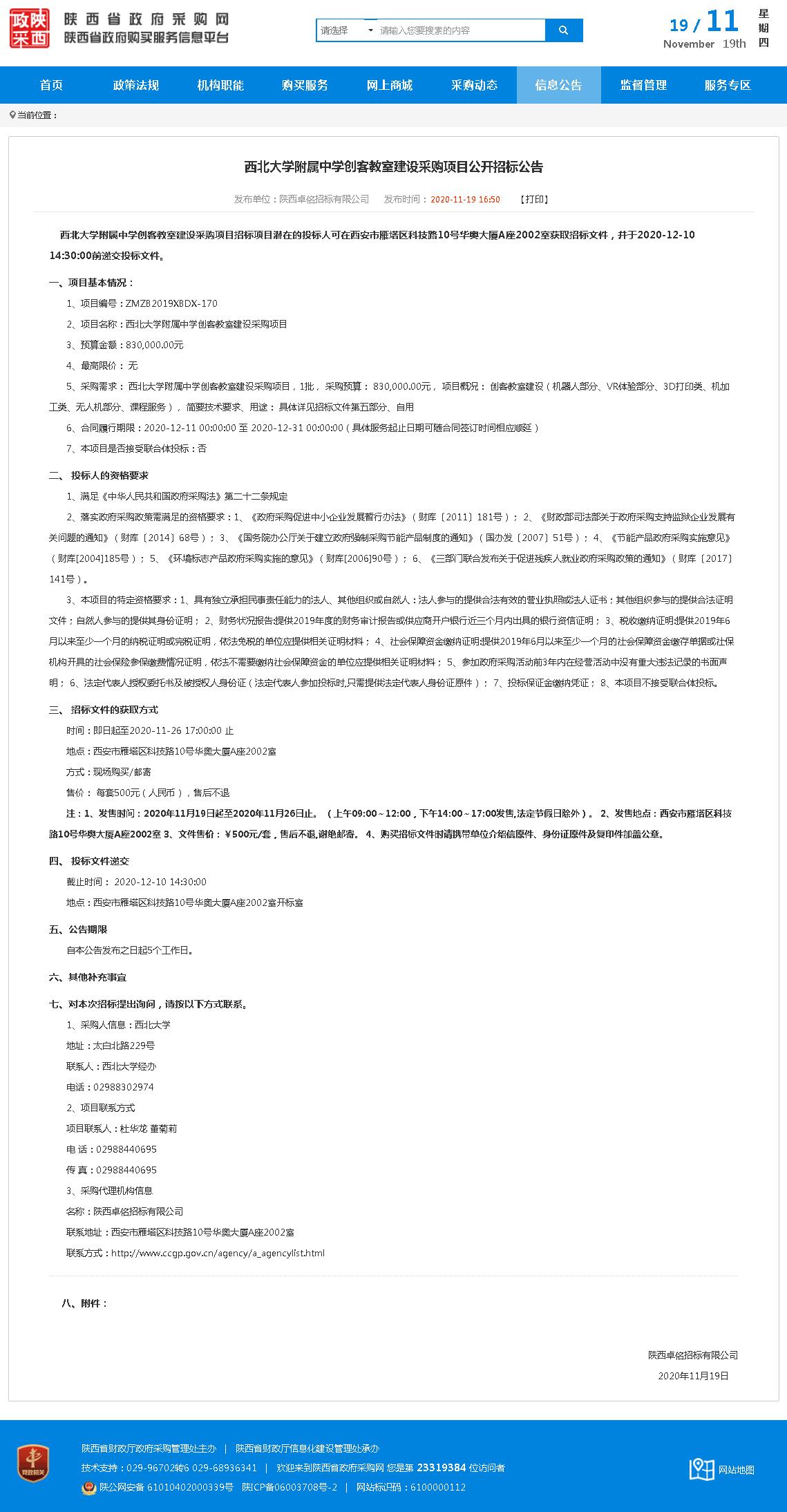 必赢3003no1线路检测中心附属中学创客教室建设采购项目公开招标公告