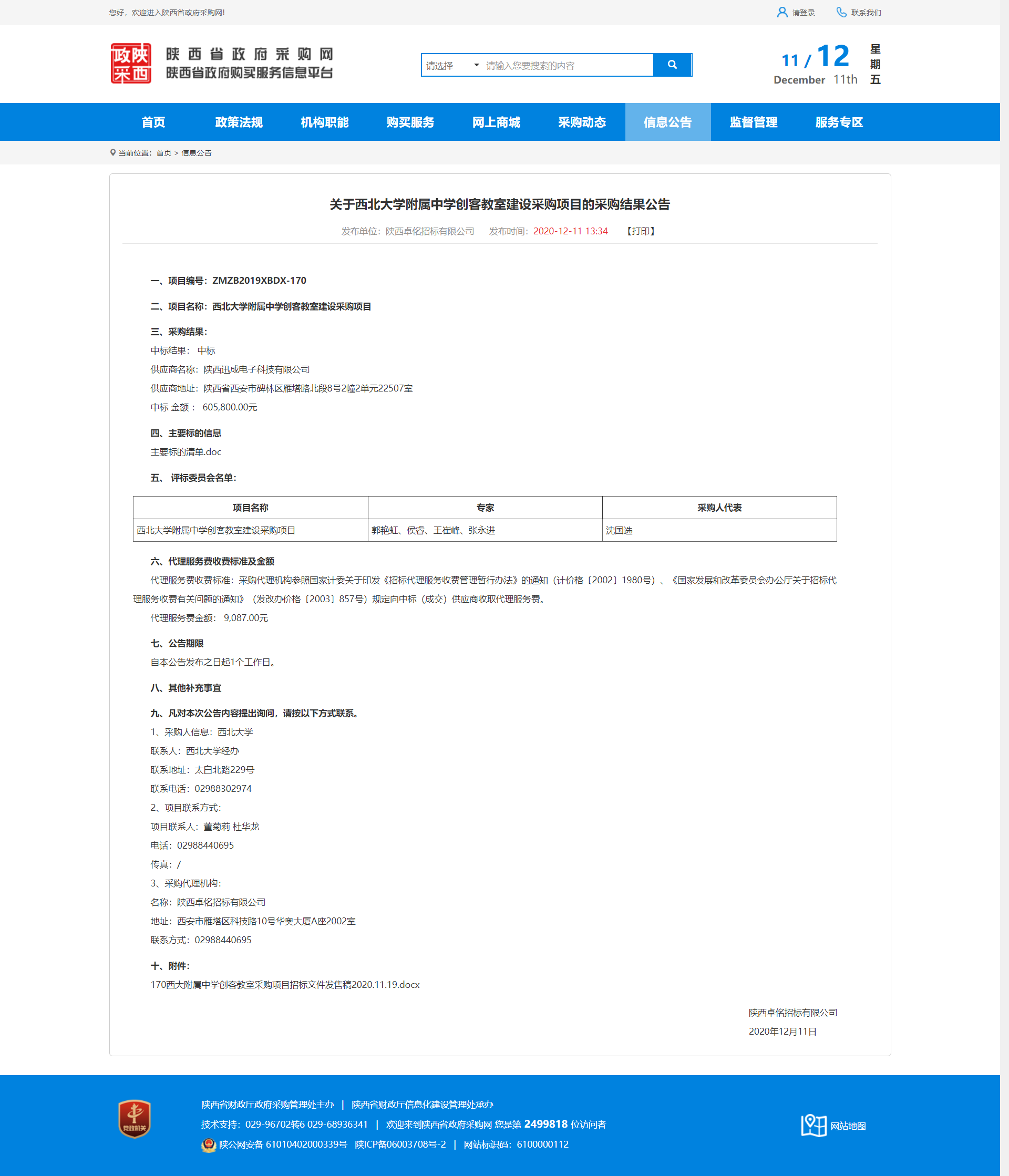 关于必赢3003no1线路检测中心附属中学创客教室建设采购项目的采购结果公告 作者: 编辑:薛利娟 时间:2020-12-11 原公告地址:http://ccgp-shaanxi.gov.cn/notice/noticeDetail.do?noticeguid=8a85be3275d5d5c2017650494fb1060f