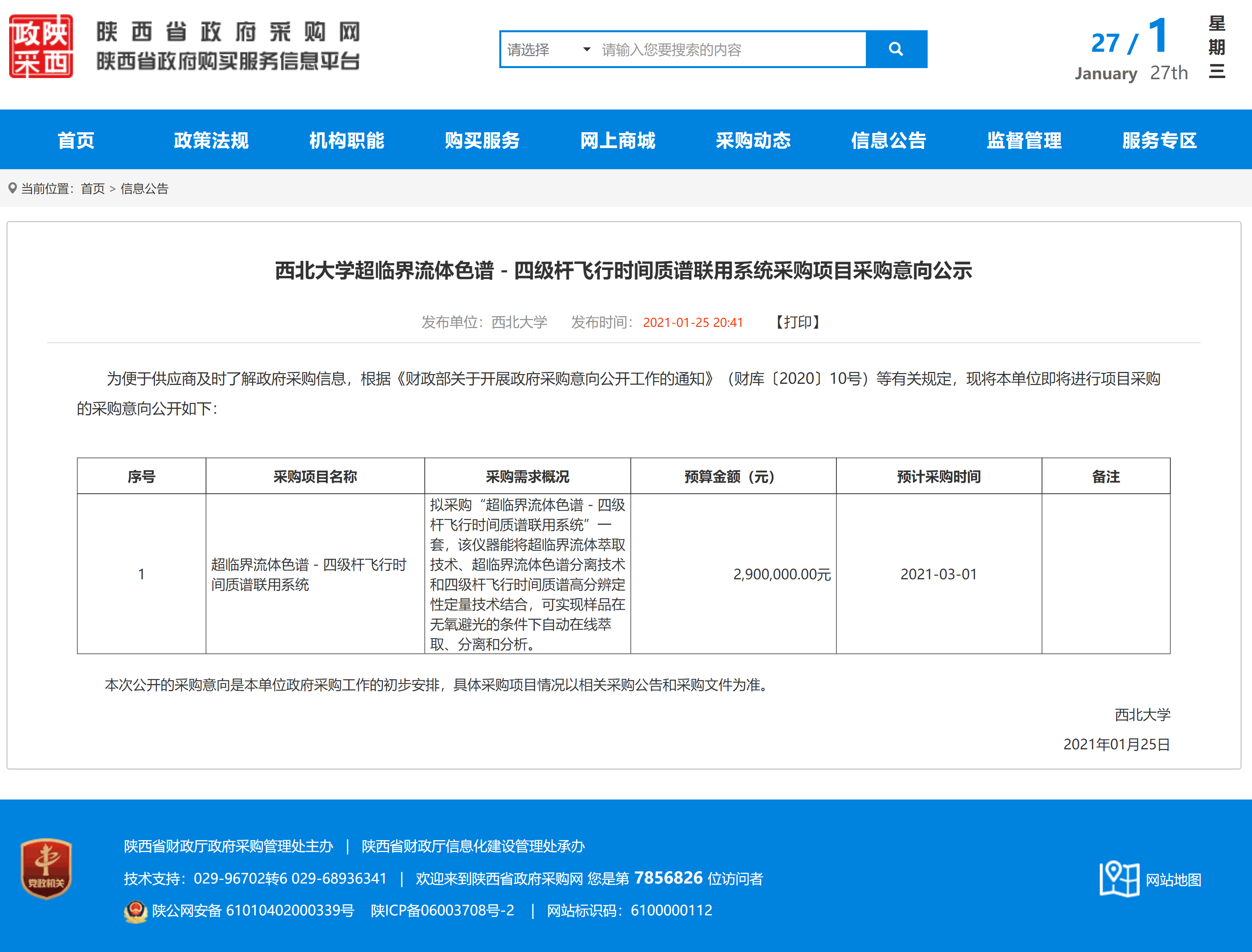 必赢3003no1线路检测中心超临界流体色谱-四级杆飞行时间质谱联用系统采购项目采购意向公示