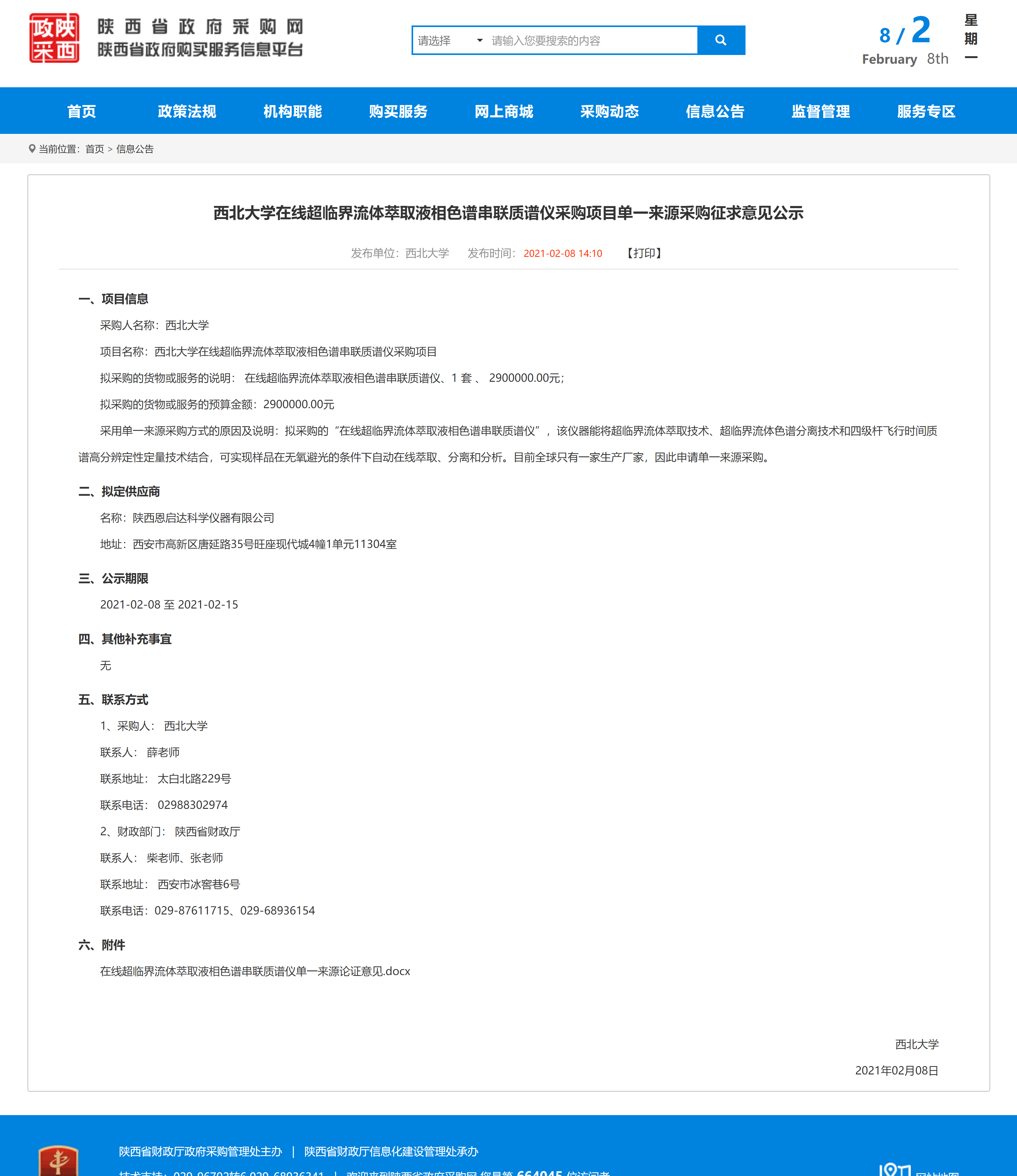 必赢3003no1线路检测中心在线超临界流体萃取液相色谱串联质谱仪采购项目单一来源采购征求意见公示