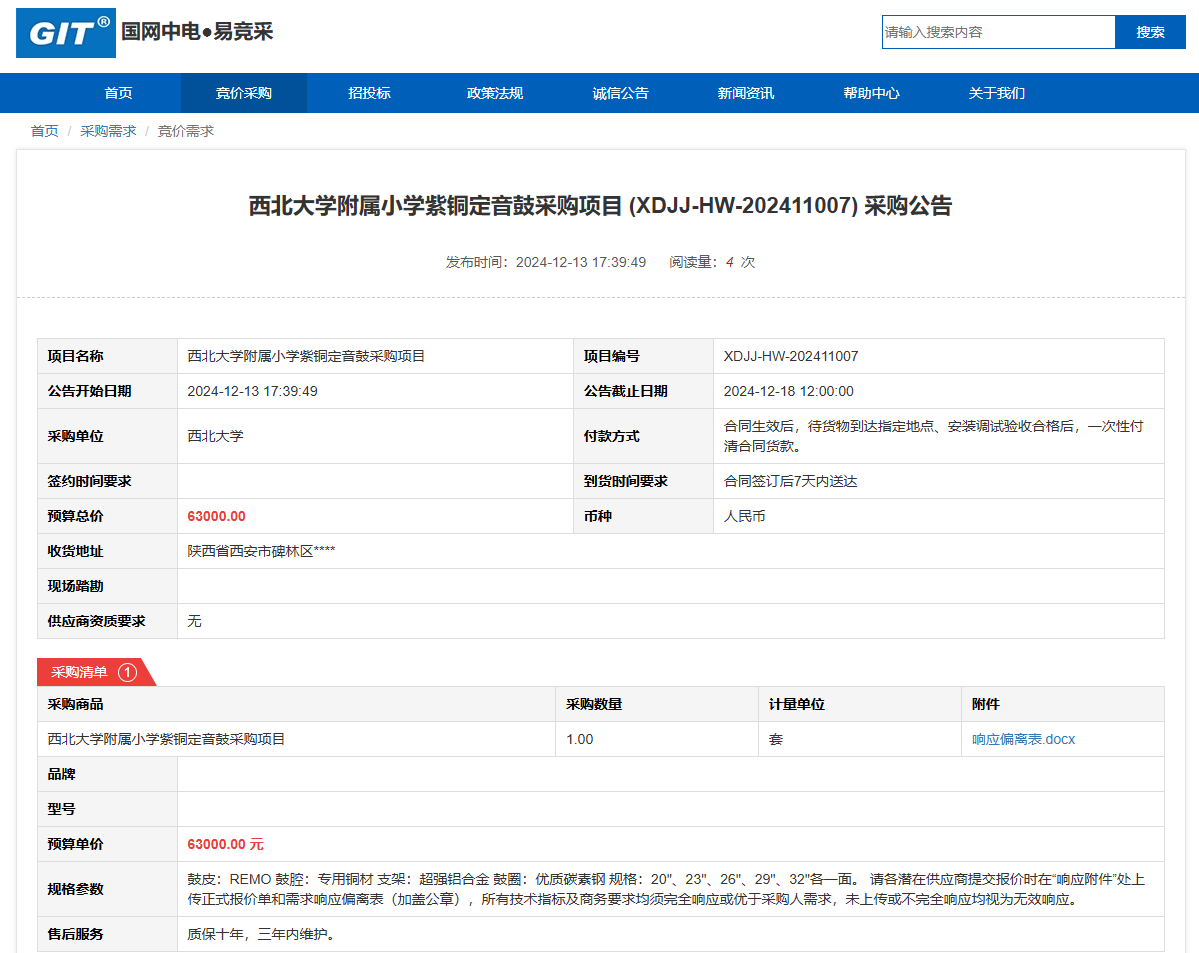 必赢3003no1线路检测中心附属小学紫铜定音鼓采购项目(XDJJ-HW-202411007)竞价采购公告 作者:采购与招标办公室 编辑: 时间:2024-12-13 原公告链接:https://www.ejingcai.com.cn/site/bidding/detail/15969