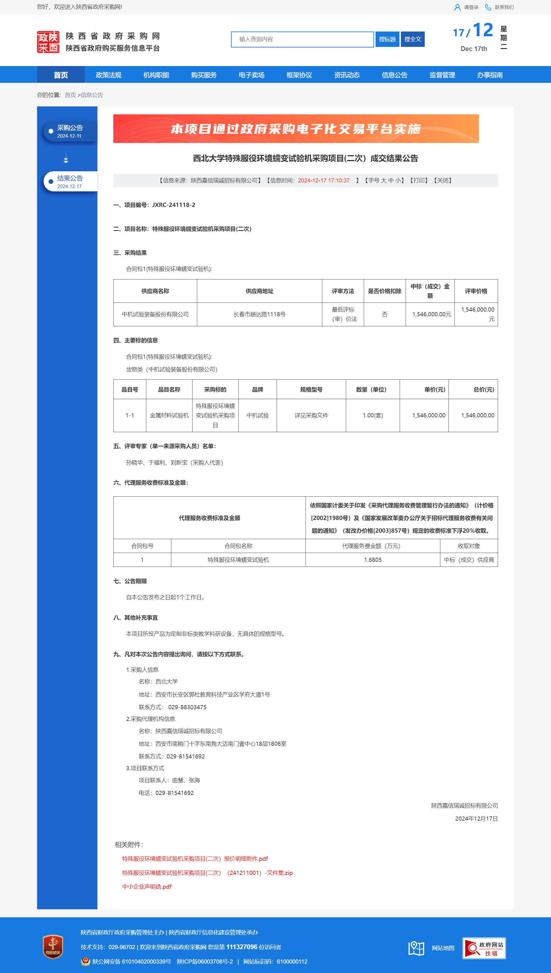必赢3003no1线路检测中心特殊服役环境蠕变试验机采购项目(二次)成交结果公告 作者:采购与招标办公室 编辑: 时间:2024-12-17 原公告链接:https://www.ccgp-shaanxi.gov.cn/freecms/site/shaanxi/ggxx/info/2024/8a69c251921857370193d3cba5716502.html?noticeType=001023¬iceId=69320abb-bc58-11ef-8063-08c0eb20c666